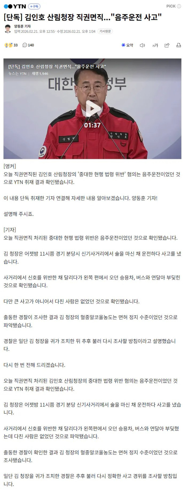 [단독] 김인호 산림청장 직권면직..."음주운전 사고"