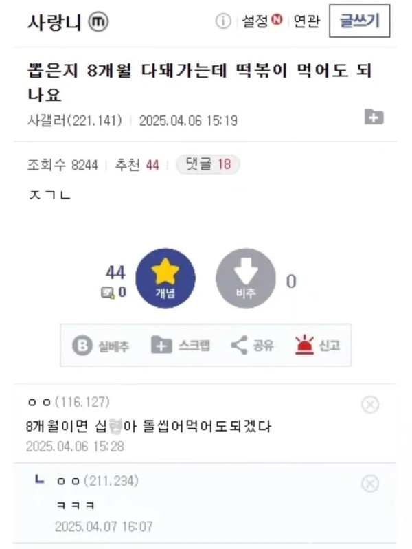 사랑니 뽑은지 8개월 됐는데 떡볶이 먹어도 되냐는 사람