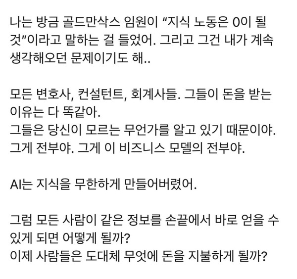 = 현 고소득 직군이 돈을 잘버는 이유: 전문 지식이 있기 때문에 그 가치가 인정받기 때문그런데 AI로 인해 지식이 무한대로 확장되면평범한 인간의 손 끝에서도 동일한 지식을 얻을 수 있게 되는 세상이 펼쳐짐