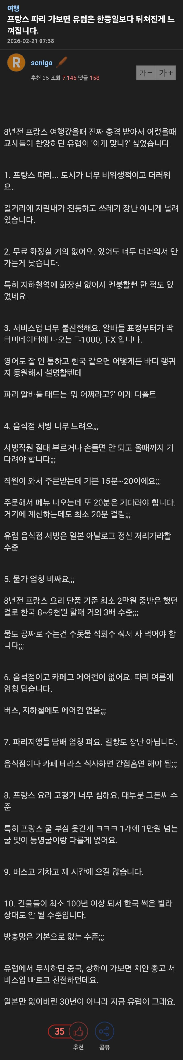 유럽여행가면 실망하는 이유 작성자 정보 홍길동 작성 작성일 2026.02.21 14:03 컨텐츠 정보 191 조회 목록 본문 비싼물가 소매치기 느린행정 인종차별 막상 여행가면 동북아 여행만도 못해서 관련자료 이전 오싹오싹 심상치않은 유럽 자동차산업 작성일 2026.02.21 14:03 다음 연천의 명물이라는 망향비빔국수.jpg 작성일 2026.02.21 14:03 댓글 0 등록된 댓글이 없습니다. 로그인한 회원만 댓글 등록이 가능합니다. 목록