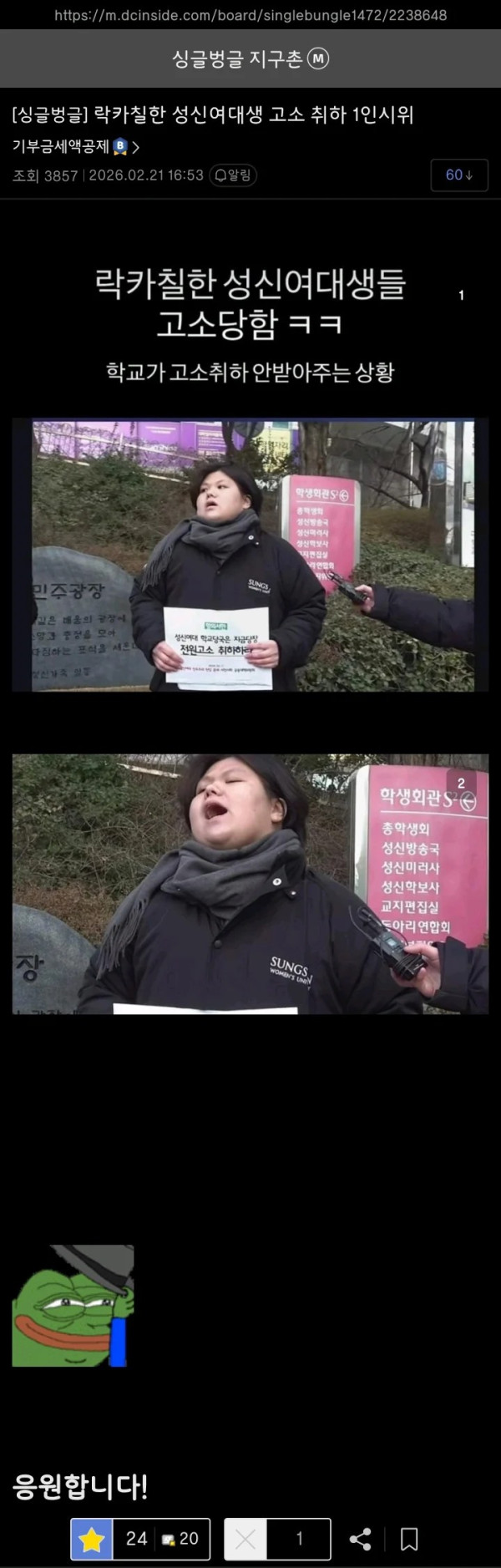 락카칠한 성신여대생 고소 취하 1인 시위.jpg 작성자 정보 이순신 작성 작성일 2026.02.21 16:03 컨텐츠 정보 216 조회 목록 본문 나도 응원함 ㅋㅋ 관련자료 이전 "친구들은 많이 벌었는데"...겁 없는 역베팅 개미 작성일 2026.02.21 16:03 다음 "민주당의 애완견"…대법관들 맹비난한 트럼프 작성일 2026.02.21 16:03 댓글 0 등록된 댓글이 없습니다. 로그인한 회원만 댓글 등록이 가능합니다. 목록