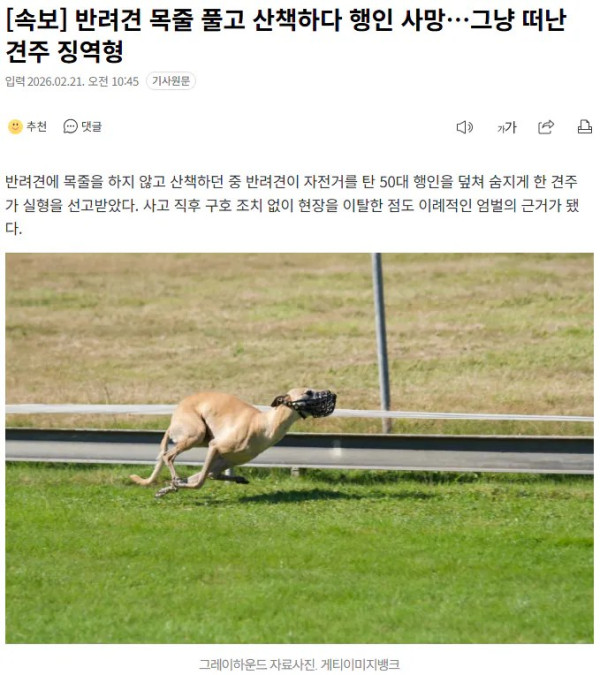 반려견 목줄 풀고 산책하다 행인 사망…그냥 떠난 견주 징역형 작성자 정보 이순신 작성 작성일 2026.02.22 00:03 컨텐츠 정보 108 조회 목록 본문 [속보] 반려견 목줄 풀고 산책하다 행인 사망…그냥 떠난 견주 징역형 관련자료 이전 백종원 방송 복귀 근황 작성일 2026.02.22 00:03 다음 용산에 오픈한 800평대 창고형 약국 약가격 작성일 2026.02.22 00:03 댓글 0 등록된 댓글이 없습니다. 로그인한 회원만 댓글 등록이 가능합니다. 목록