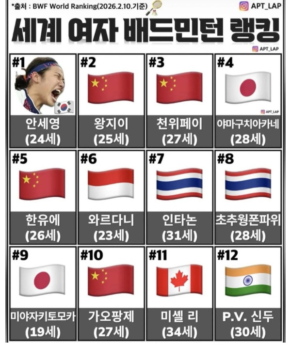 여자 배드민턴 세계 랭킹 작성자 정보 강감찬 작성 작성일 2026.02.22 03:06 컨텐츠 정보 301 조회 목록 본문 관련자료 이전 홀리마더 작성일 2026.02.22 03:06 다음 ■태극기 게양 바로 잡았다■ 작성일 2026.02.22 03:06 댓글 0 등록된 댓글이 없습니다. 로그인한 회원만 댓글 등록이 가능합니다. 목록